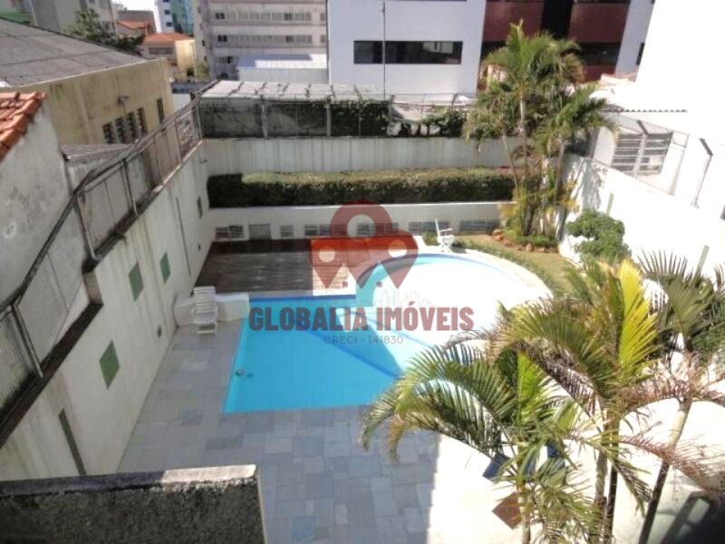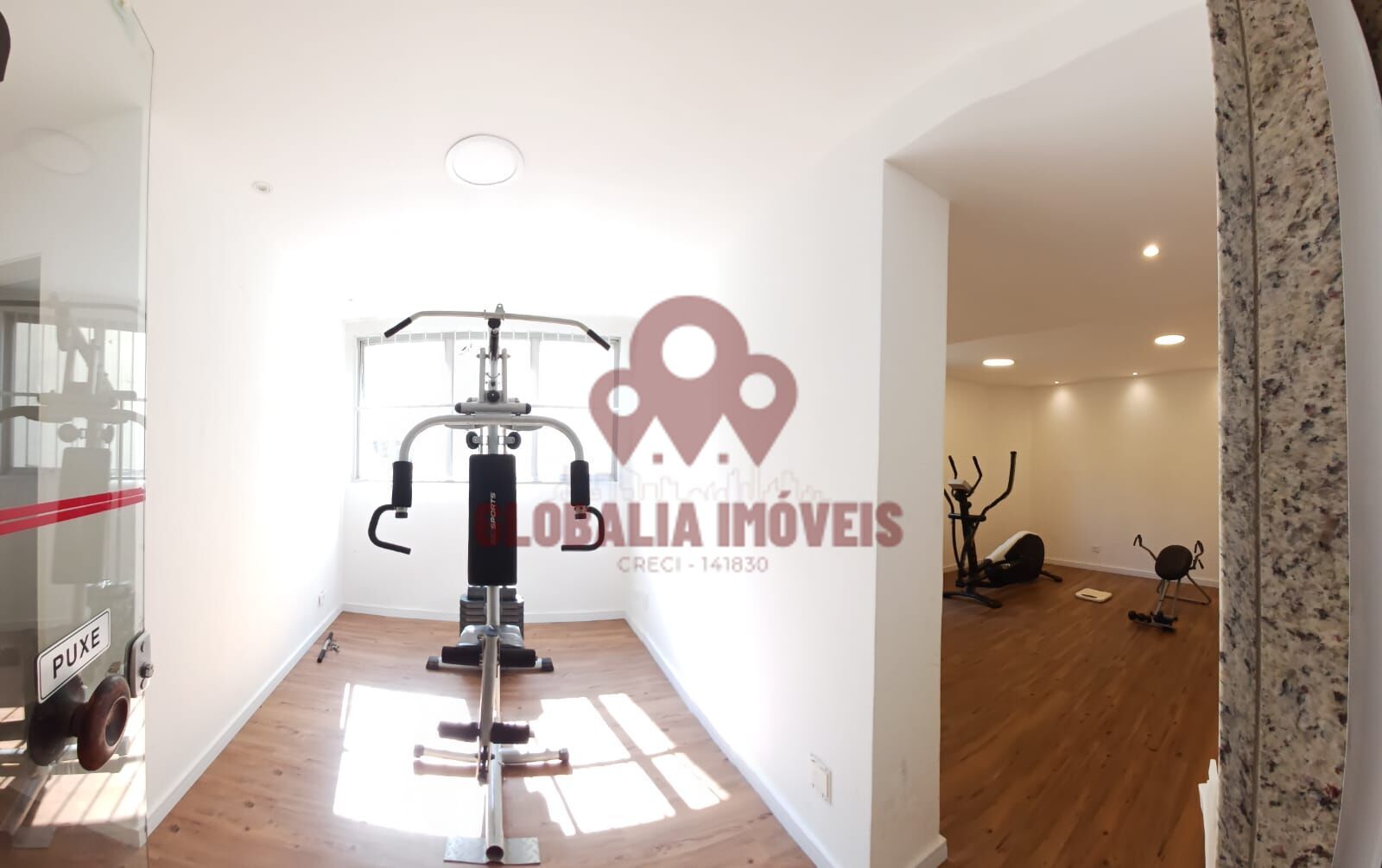 Área de lazer com piscina, churrasqueira, sala de ginástica e salão de festa.