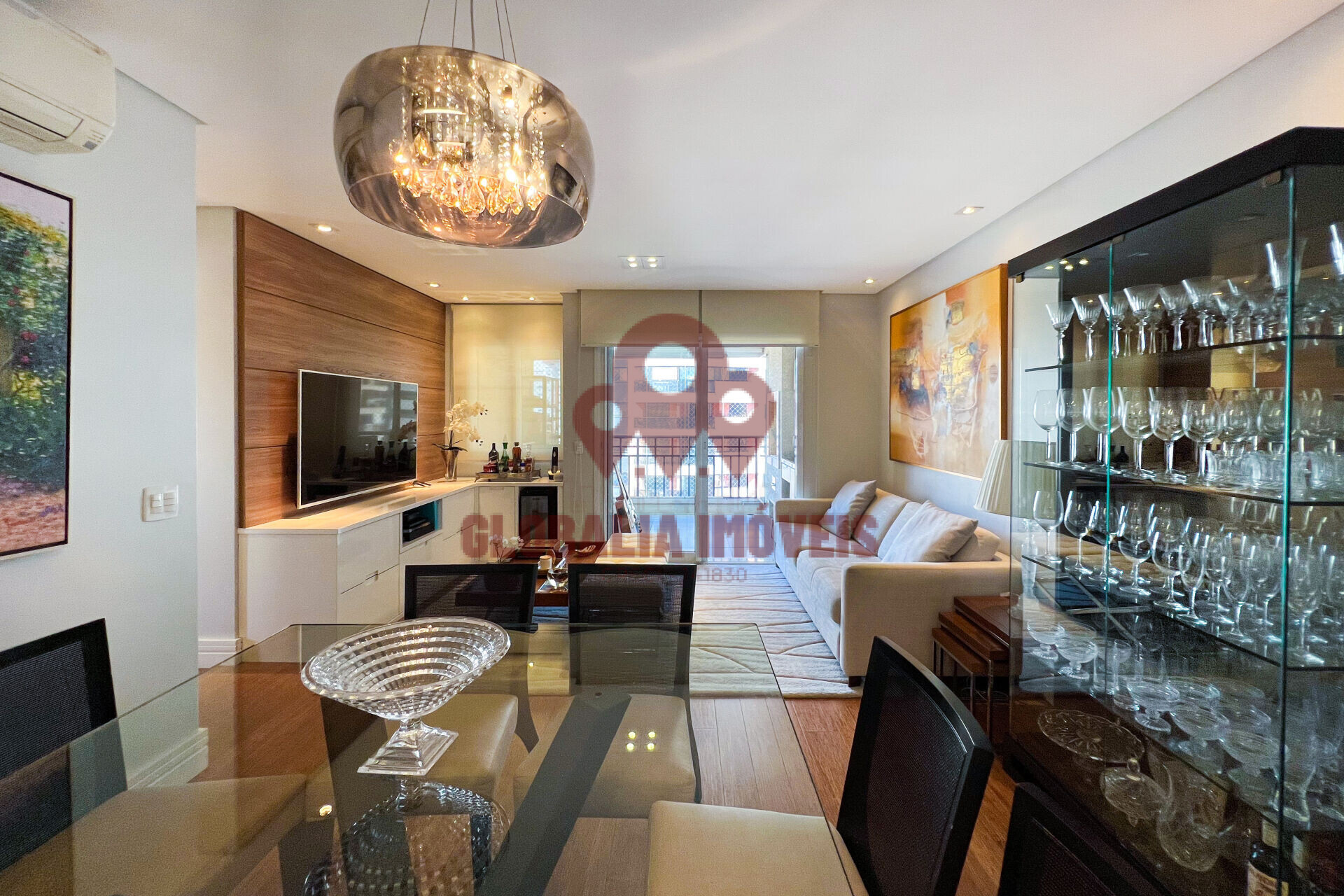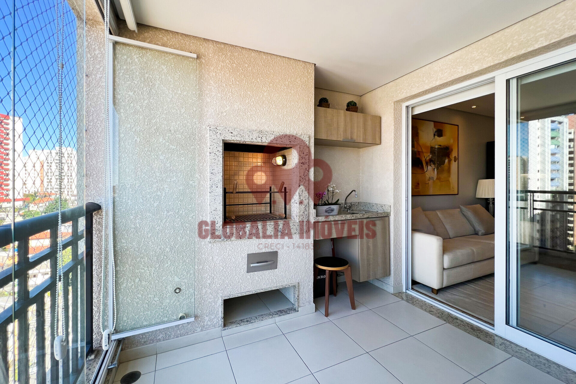 Ampla sala de visitas, varanda espaçosa com vidros retráteis e churrasqueira. Lavabo. Cortinas internas Hunter Douglas. 02 Suítes, banheiros com box blindex e pias de mármore branco, sendo a Suíte Master com Closet. Armário embutido e ar-condicionado Fujitsu quente/frio em todos os ambientes, lindo piso de bambu importado de alta densidade para tráfego intenso. Cozinha Americana com armários, pia de granito, lava louças, micro-onda geladeira 2 portas e fogão 5 bocas à gás com exaustor italiano potente. Área de Serviço ampla com armários, varal, WC de serviço, aquecedor a gás, Lavadora/Secadora de roupas, e área técnica dos condensadores de ar-condicionado isolada.
