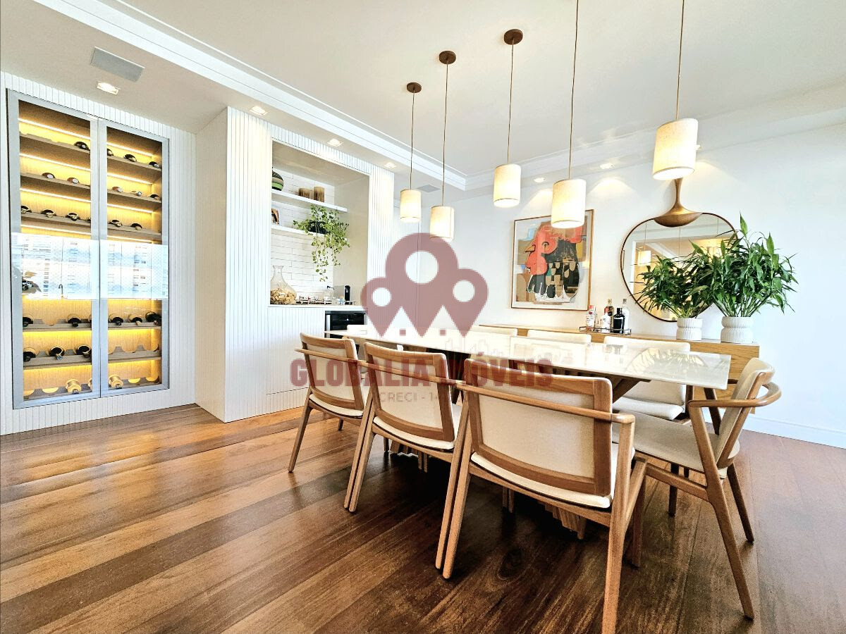 A varanda gourmet é integrada à sala de jantar, que ainda oferece armários, além de uma belíssima adega seca.