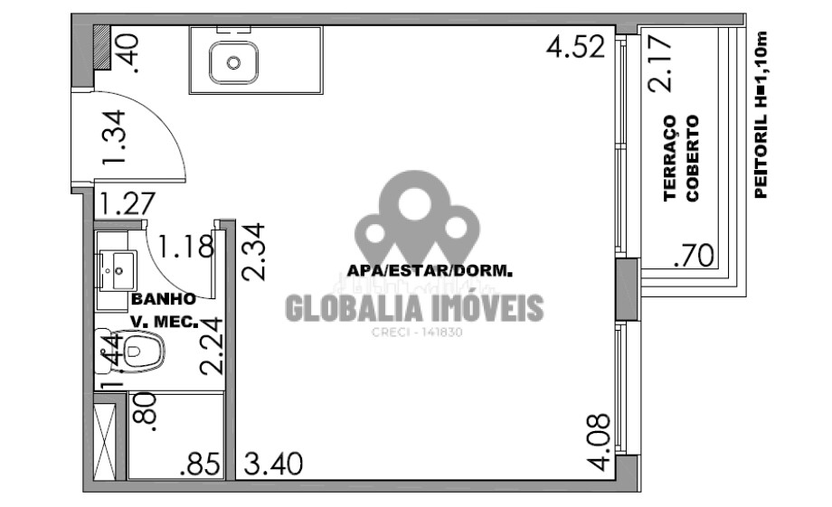 Studio com 24m², banheiro, estar/ dormitório, cozinha integrada, terraço coberto onde serão entregues com: Aquecimento Central de Água, Fechadura Eletrônica, Infraestrutura para ar-cond*, Piso e Luminárias, Ponto Máquina de Lavar 3kg e Tomadas USB.