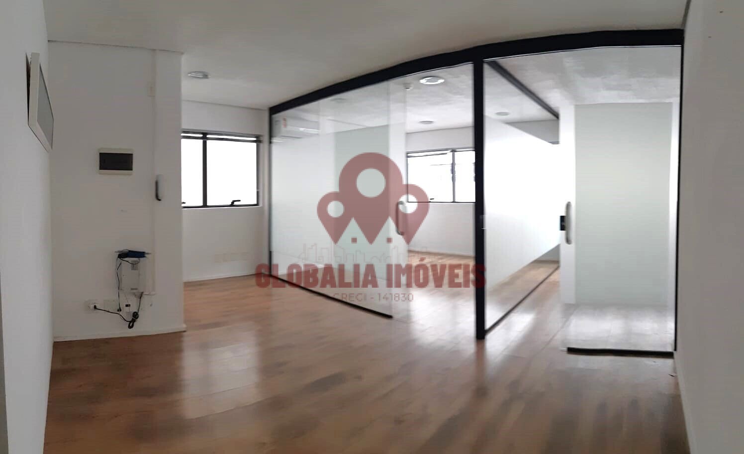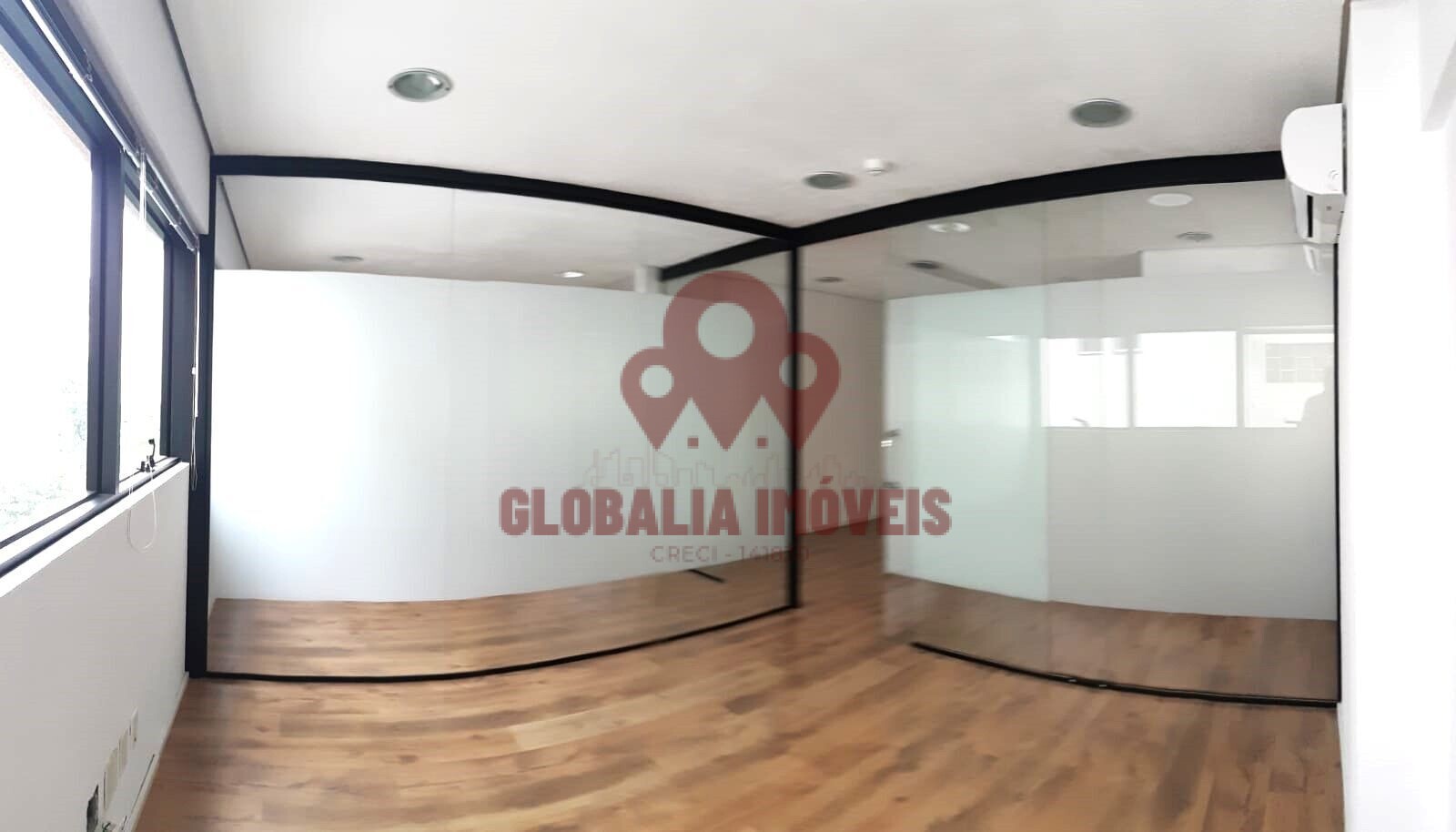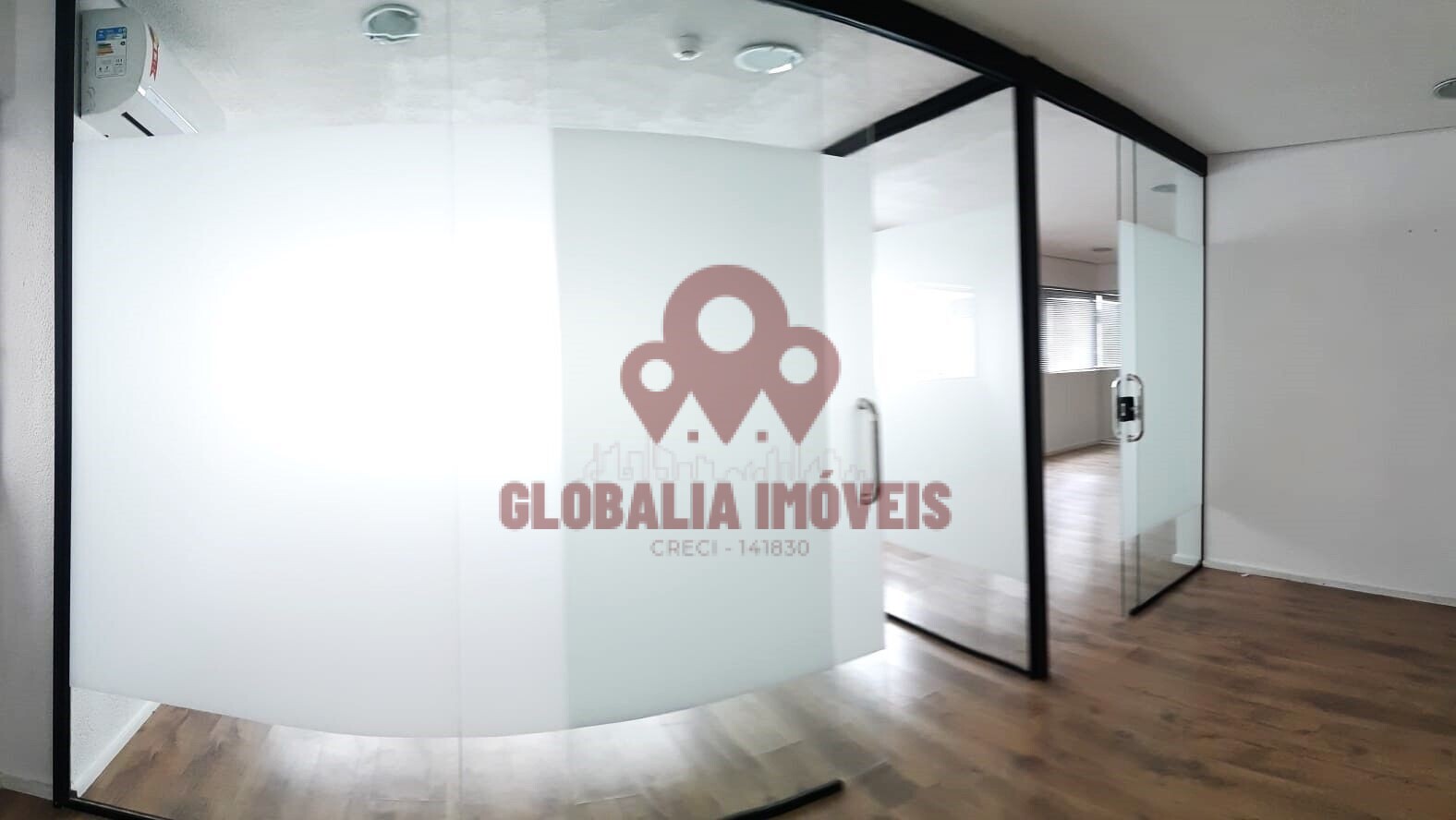 Sala Comercial com 64m², com piso de laminado de madeira, recepção e sala de espera, sala de reunião, sala ampla de trabalho, arquivo deslizante, ar-condicionado, 2 banheiros e 2 vagas de garagem.